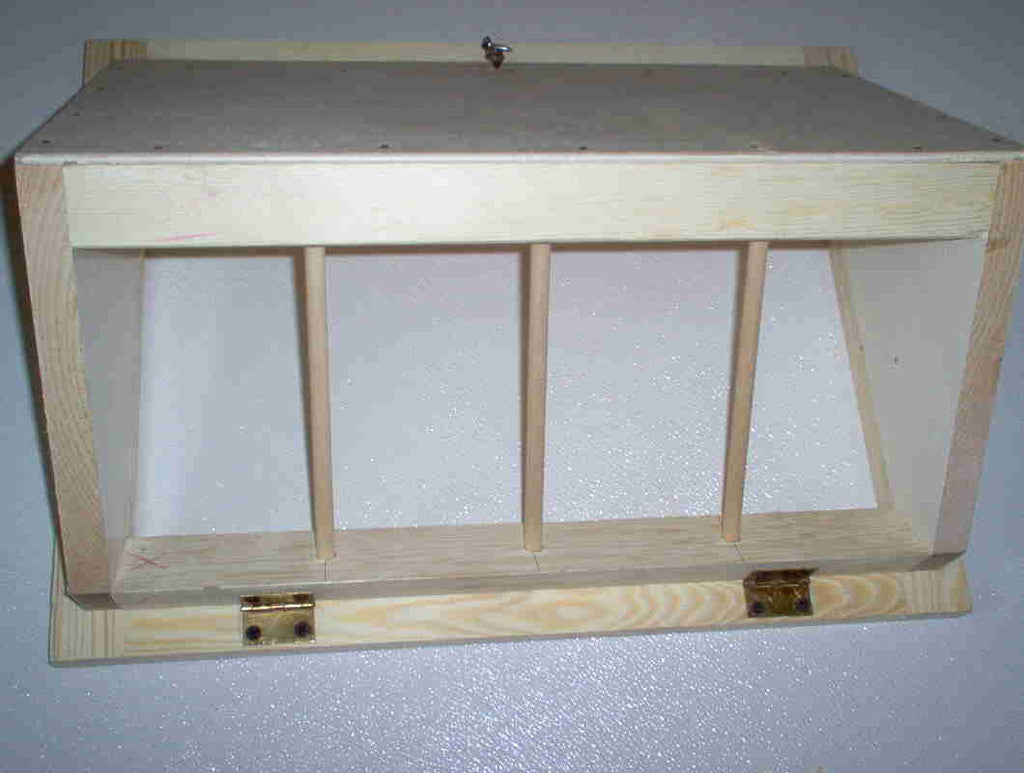 Pictured is a four hole Belgium style drop trap which is most commonly used. It comes with a hinge on top, so you can release the birds through the same opening. Many fanciers including myself, use this style trap with the electronic timers. It seems to save time trapping birds in over the "bob style trap"
