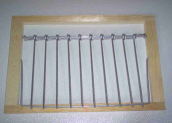 Our Bob-style trap features a heavy-duty wood frame that measures approximately 12 inches high and 18 inches wide. The individual bobs are made from 3/16" heavy-duty aluminum bob rods and the wire lifter locks the trap door open when needed.